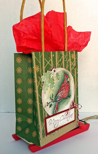 We hebben hier vandaag zomaar ineens weer 15 graden Celsius en een heerlijk zonnetje. Mijn favoriete vogel, de Cardinal, zag ik net weer in de achtertuin. Ze komen af op de door mij neergelegde zonnebloempitten. Het is zo mooi om naar te kijken en ik kan mijn geluk niet op als ook het vrouwtje nog meekomt! Als er sneeuw ligt, valt dit prachtige kleurrijke koppel nog meer op. Hopelijk krijg ik ze deze winter samen goed op de foto. Vandaag wil ik jullie dan ook een christmas gift bag laten zien met deze mooie vogel erop.